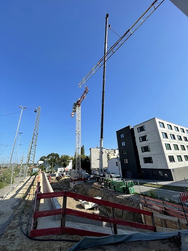 Der Kranaufbau ist Anfang Juli erfolgt. Nach Abschluss der vorbereitenden Grundleitungs- und Erdarbeiten wird noch in diesem Monat mit den Hochbauarbeiten begonnen.