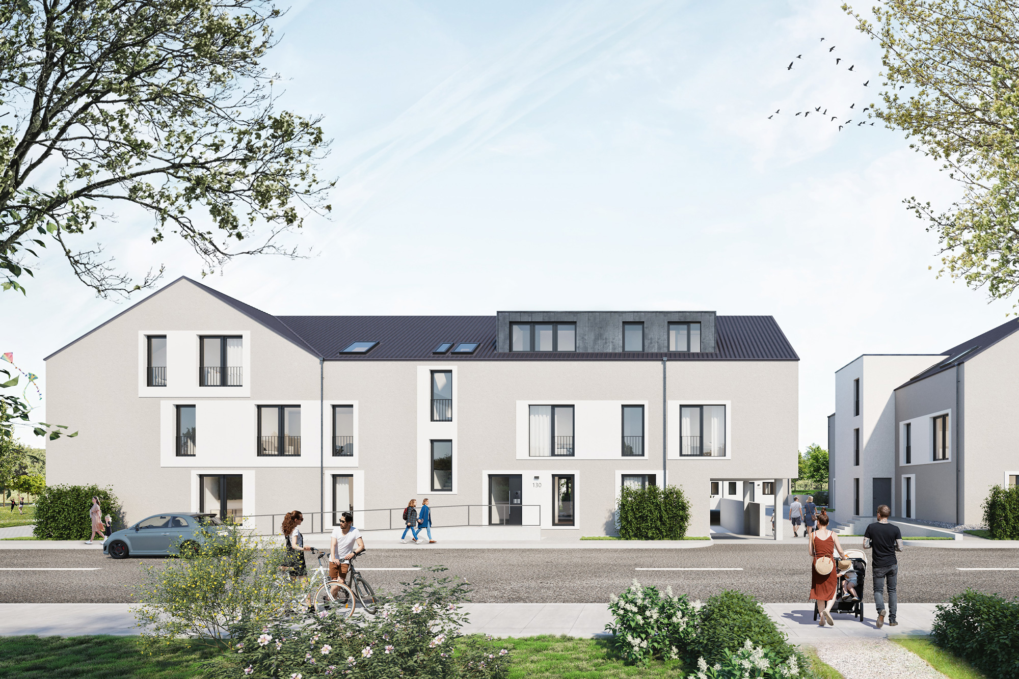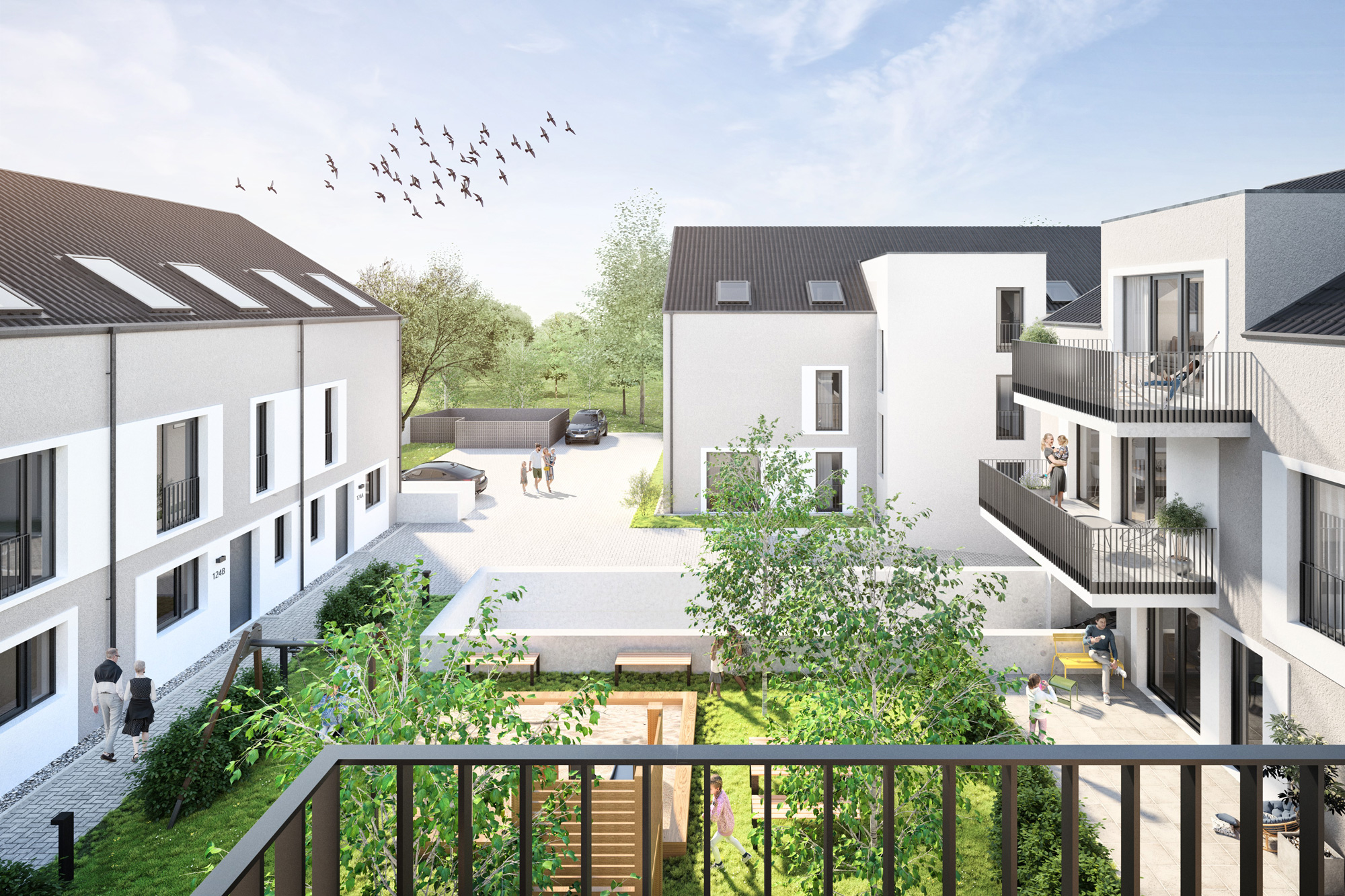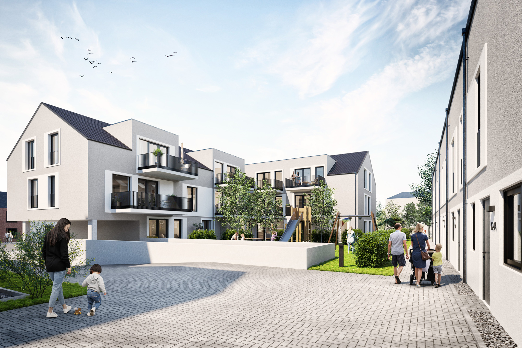 Heimkommen im Rodehof. Ob es ein eigenes Haus oder eine moderne Wohnung sein soll, entscheiden Sie selbst. 23 Wohnungen und 6 Einfamilien-Reihenhäuser bilden eine Einheit, der offene Innenhof bildet den Mittelpunkt.