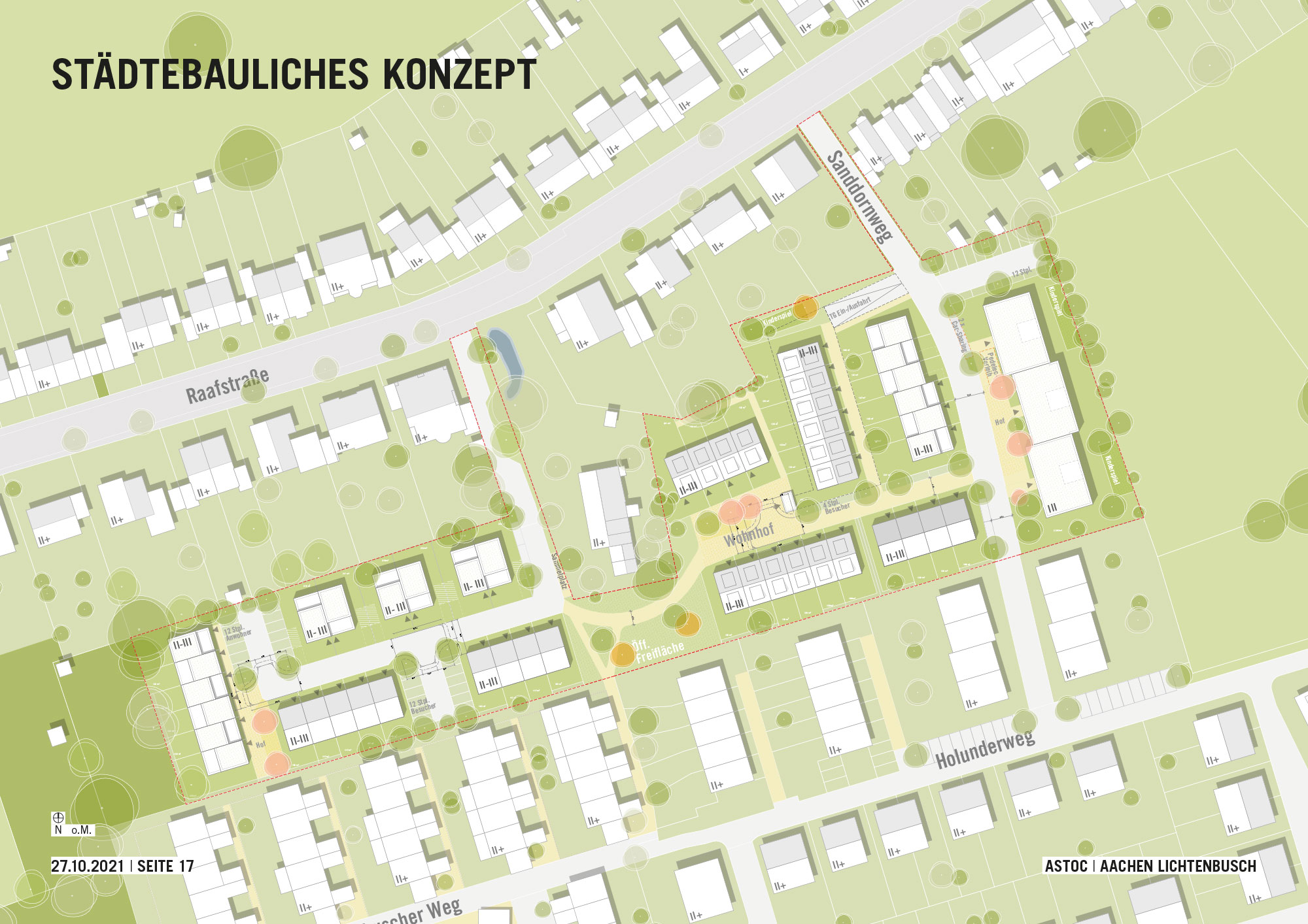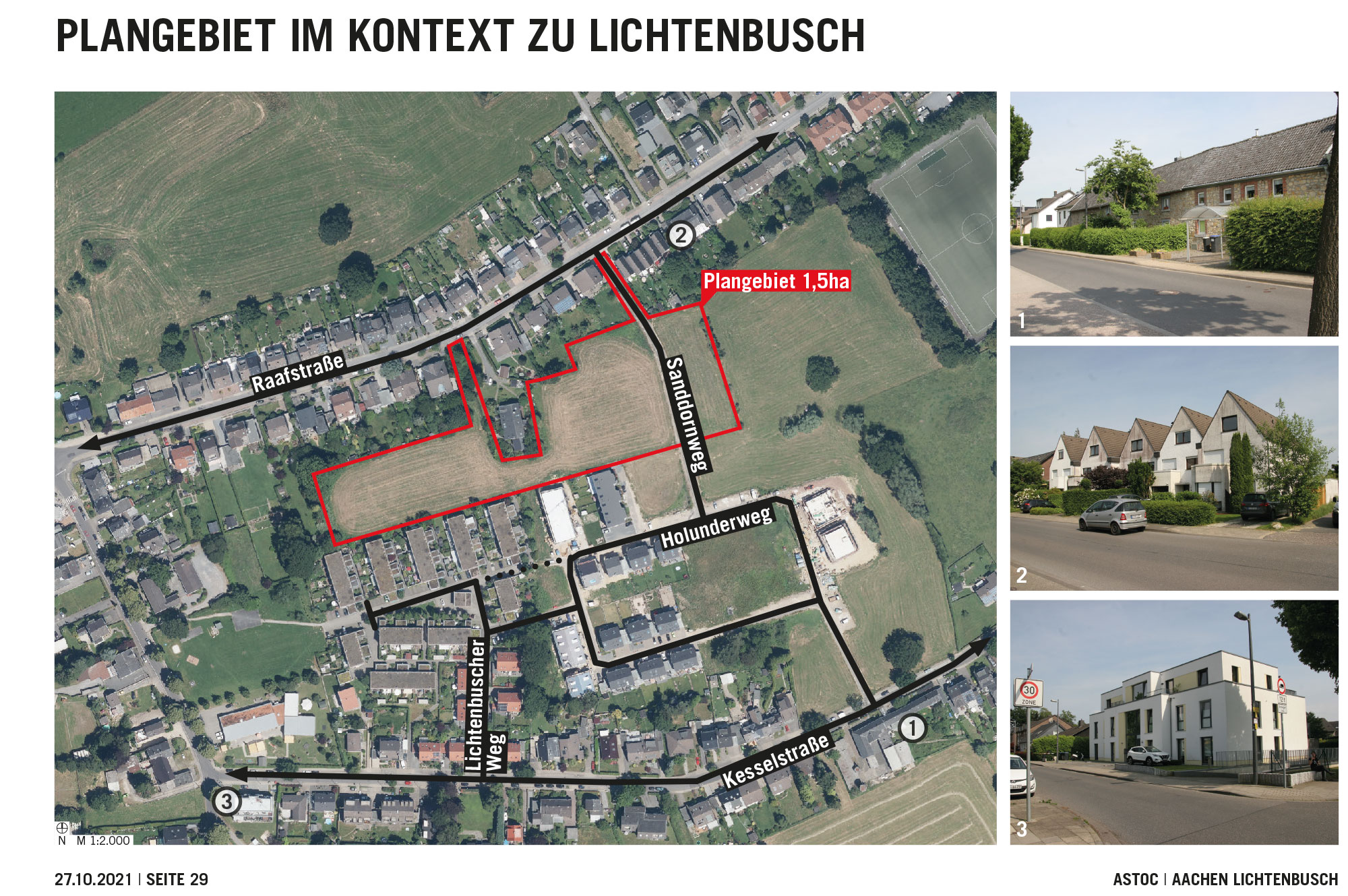 Die Entwicklung des Grundstücks markiert den dritten und abschließenden Baustein eines Neubauquartiers zwischen Kesselstraße und Raafstraße in Aachen Lichtenbusch. Das städtebauliche Konzept sieht eine Mischung aus grundgebundenen Wohntypologien als Doppelhäuser und Reihenhäuser sowie Geschosswohnungsbau vor.