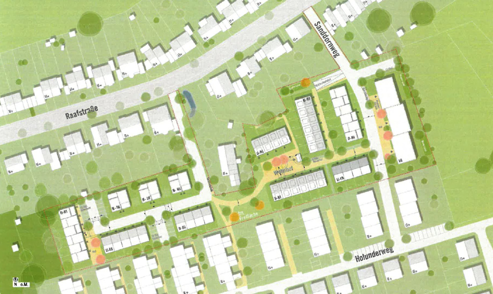 Auf dem Grundstück verbinden sich drei unterschiedliche Typologien zu einem Ensemble. Der straßenbegleitende Geschosswohnungsbau entlang dem vorhandenen Sanddornweg bildet den städtebaulichen Abschluss des Neubaugebiets zu den Grünflächen hin. In zweiter Reihe soll ein Wohnhof entstehen, dessen Baukörper sich um eine gemeinsame Mitte als sozialer Treffpunkt herumgruppieren. Im westlichen Bereich des Gebiets sind eine Reihenhaus- sowie Doppelhausbebauungen vorgesehen, die mit einer separaten Erschließung von der Raafstraße aus angebunden werden.