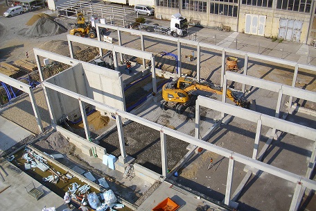 Die Bindermontage ist zu 75% abgeschlossen und die Doppelwandmontage noch in Arbeit,