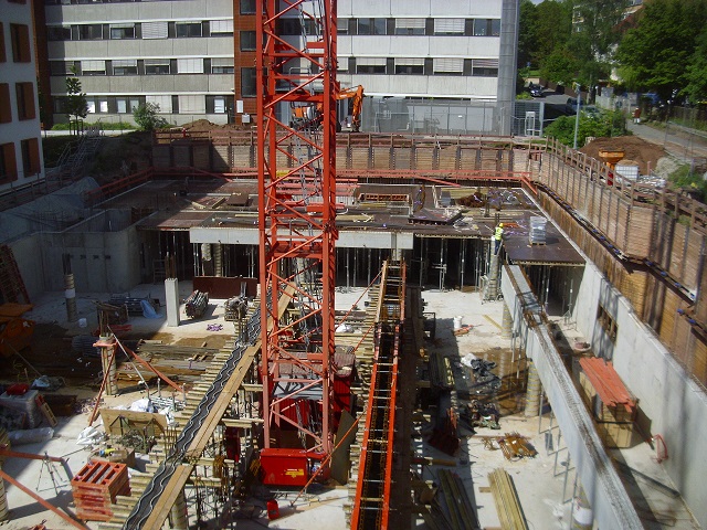 Der Neubau gliedert sich in 7 Etagen - eine Tiefgaragenebene mit 6 Obergeschossen und wird komplett als monolithisches Ortbetonbauwerk mit zum Teil