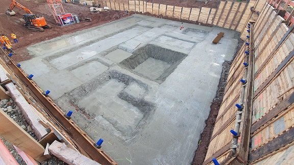 Sichtbetonanforderungen in SB 3 errichtet . Die Baugrube wird derzeitig ausgehoben und die Gründungsebene mit Sauberkeitsschicht versehen.“