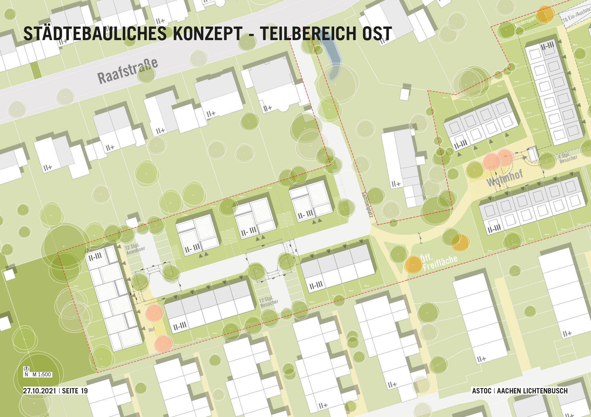 Die Entwicklung des Grundstücks markiert den dritten und abschließenden Baustein eines Neubauquartiers zwischen Kesselstraße und Raafstraße in Aachen Lichtenbusch. Das städtebauliche Konzept sieht eine Mischung aus grundgebundenen Wohntypologien als Doppelhäuser und Reihenhäuser sowie Geschosswohnungsbau vor.