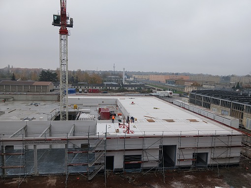 Aktuell erfolgen mit einem Vorlauf von ca. 6 Wochen zum Terminplan bereits die Verlegearbeiten der Porenbetondachplatten.